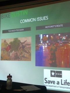 Who knew that the Texas Department of Transportation, the highway and toll road people sponsored classes for bicyclists?  They’re also for car drivers to learn how to respect the rules of the road and vulnerable road users, i.e., dudes and dudettes on bikes. So on Saturday I saddled up and sauntered slowly downtown despite my ongoing allergies or whatever they are to get a little knowledge dropped into my mountain cedar-induced feverish brain.  And I may have learned a thing or two.  It turns out that you can teach an old dude new tricks.  Not like, magic, or BMX, but you know, tricks.