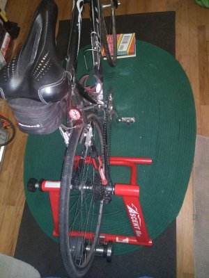 I finally fixed my flat and put the old Fuji Silhouette on the heavy Mag Ascent home trainer. Below is a shot of my GPS data on Strava. I went for 15.2 miles per hour for half an hour, which isn’t great but it is a ilttle faster than usual. I had it set on the lowest of three resistance levels, and usee the gears to get a slightly harder workout. The trainer is heavy steel so is not going anywhere. All you need is to fit the rear wheel correctly into slots, which is very intuitive at least with my bike, then prop up the front wheel; I used books. Overall it was sturdy, easy to get started on, and it doesn’t take up alot of room.