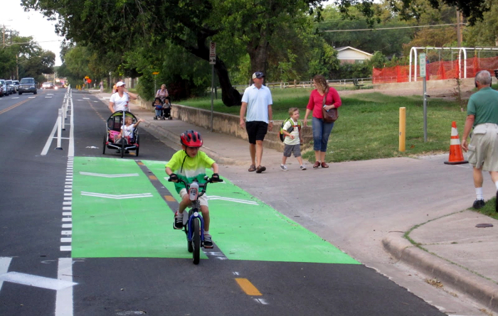 This is a semi-protected bike lane so kids can get to school at Bluebonnet Elementary in Austin, TX. Source: People for Bikes