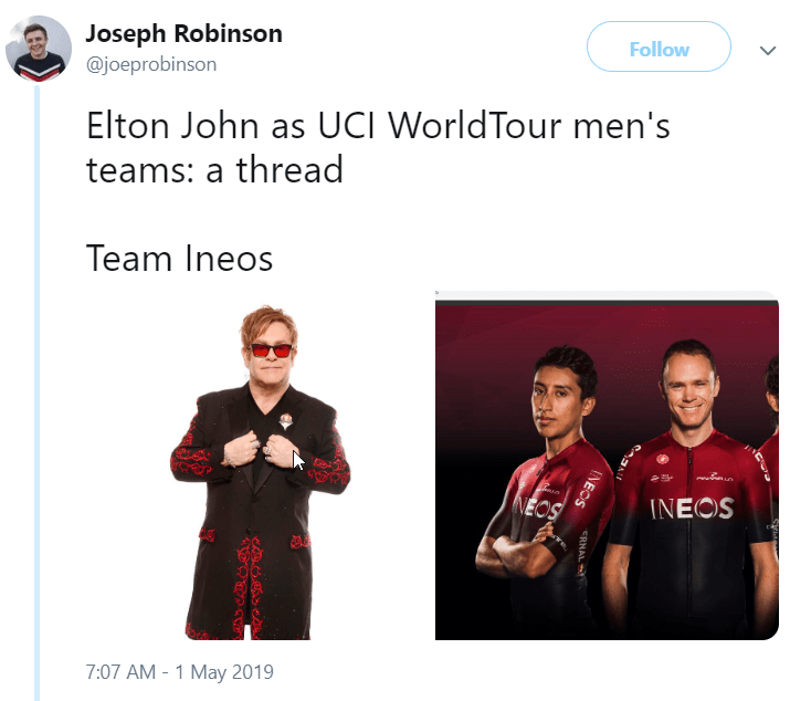 Here’s a funny thread by @JoePRobinson on Twitter comparing Sir Elton’s costumes to pro cycling team kits.