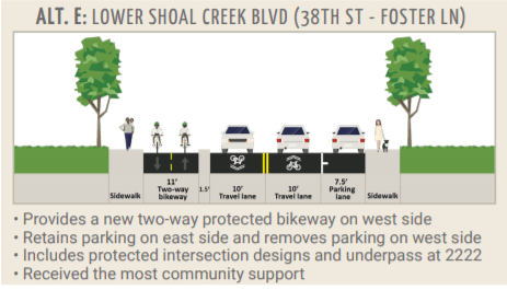 After a several year grassroots campaign by members of Bike Austin and Walk Austin, victory was achieved! The City of Austin (Texas) announced it will construct a two-way protected bicycle lane on the west side of the major bike thoroughfare from 38th Street to Foster Lane. From that point to 183, it will put in one-way bicycle lanes on each side of Shoal Creek Boulevard (SCB). This is an important win for bicyclists of all kinds who use the street, as well as for pedestrians. Because currently it’s a mess of weaving in and out of parked cars, which can be deadly. The details are below.