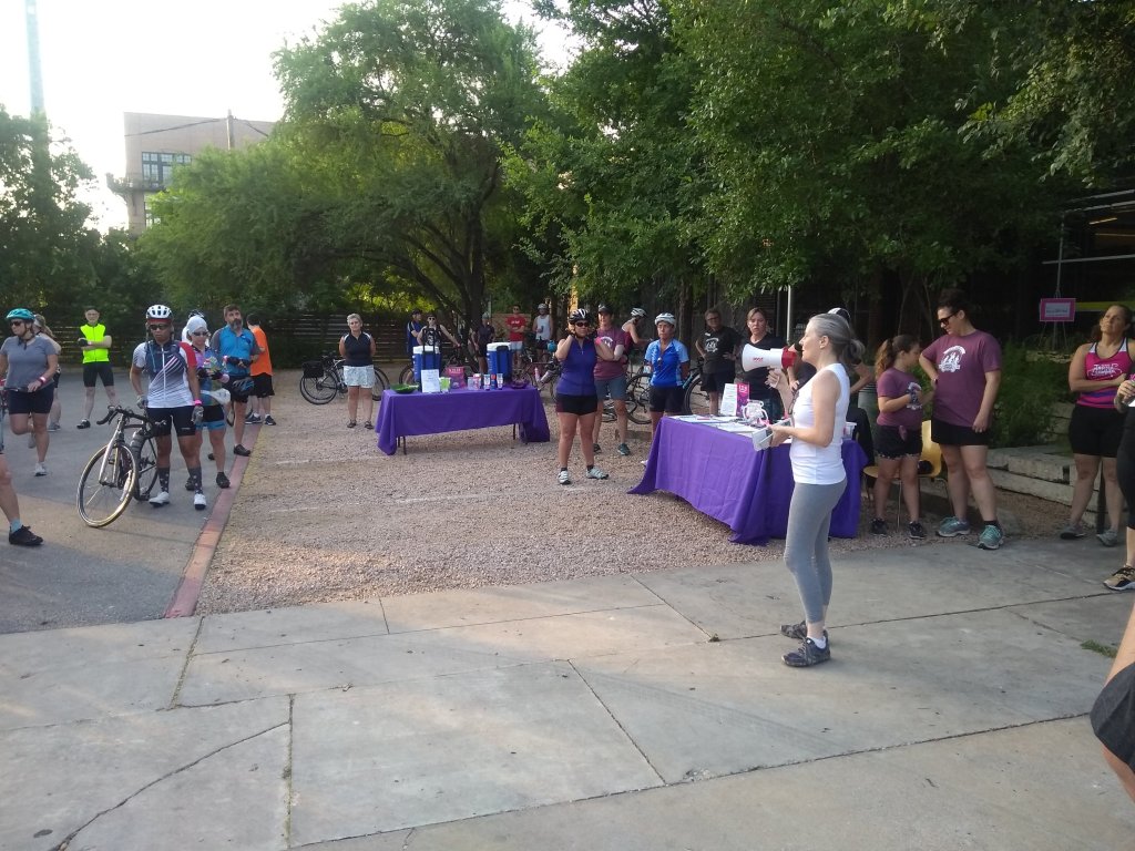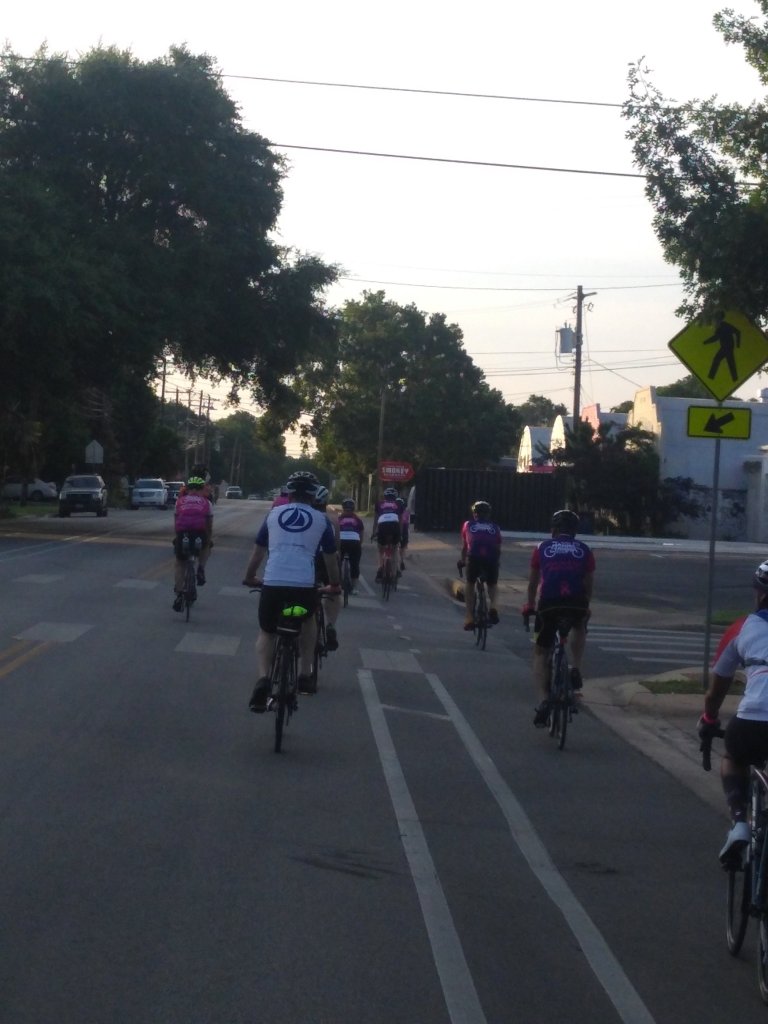 On Wednesday, I formed a neighborhood bike gang. On Friday, one of my intrepid new bike friends said that she might want to join me on this training ride the next morning. Romy offered to pick me up in her bitchin’ mini-van. This was good news: The start time was an hour earlier due to the Austin, Texas heat, so I wouldn’t have to bike the extra six miles to the start.