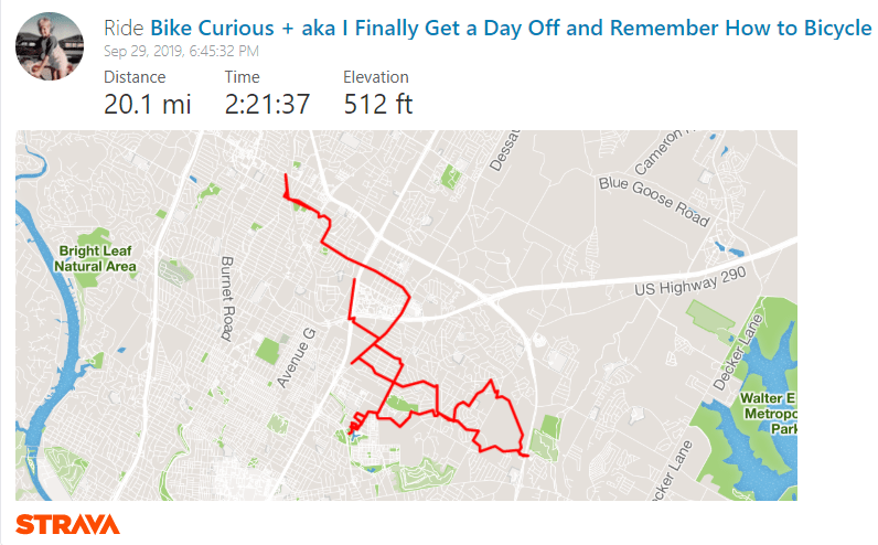 The harsh truth is that you are the only one who can get you over that hiymp from not riding to riding. But if you can and once you do, you’ll be rewarded with the incomparable feeling of accomplishment. Here’s the Strava link to my latest bike ride.