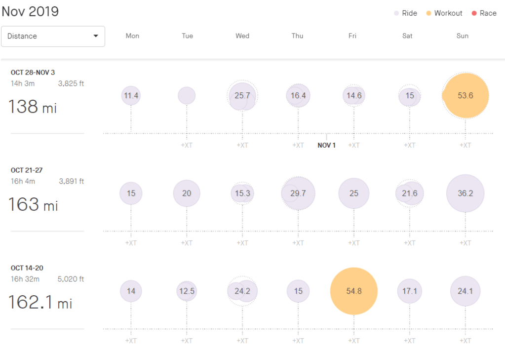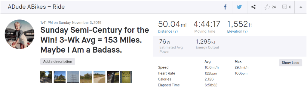After saying in my last post I wasn’t always fond of posting statistics, I’m now going to do just that. Because, miles, baby! Turns out that I’m averaging 154 miles per week. Sunday was terrific weather here in Central Texas, so I took advantage of it and went for over half a century. If you’re just joining us late, I ride a bicycle. With my, um, age and weight “situation,” I’m bushed, even with the “extra” hour from the end of Daylight Savings Time. And yet I’m pretty proud of my work ethic cranking out the kilometers making up for some missing miles this summer while working and gasp! driving. Pride goeth before the fall, but let’s hope that’s not the case.