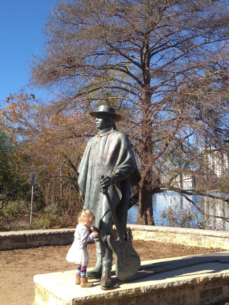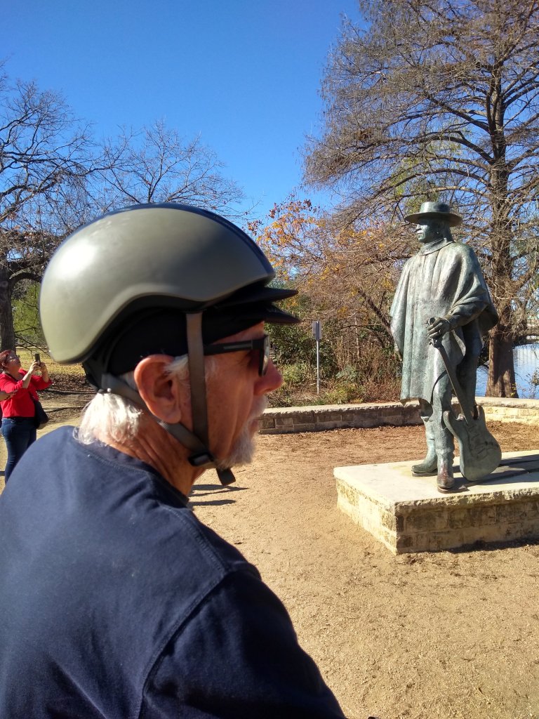 On Saturday, I got together with buddy Rhodney and a friend of his for a relaxed 13-mile ride east on Town Lake. Before we departed from Auditorium Shores, we paid homage to the guitar great who adopted Austin, Stevie Ray Vaughn. I got to seem him play live once, maybe twice. Man, was he ever the real deal! Sadly he died before his time in a helicopter crash after a concert. But we still have his music and memory to hear and keep alive. His guitar was underwater during bad floods a while back.