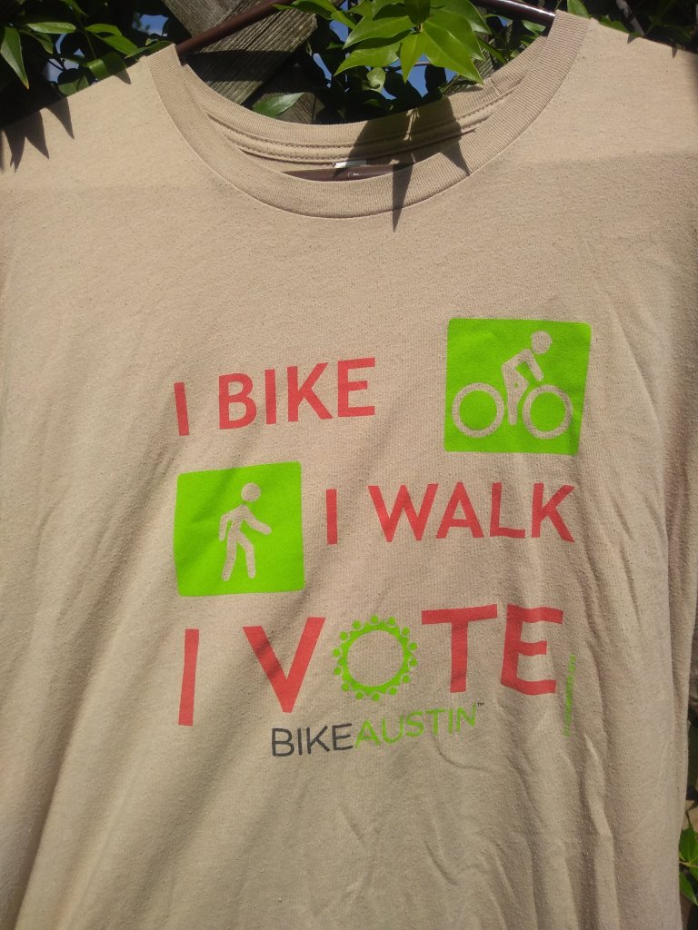 Around this time there was also a Mobility Bond up for a vote in the Austin, Texas 2016 election. It passed and lined up funds for projects like for the streets mentioned. I was working with another staff member to get people to pledge to vote for it. We did block-walking, tabling at community events, and hung out by the huge bike parking lot for the Austin City Limits Festival. Julia gave me this shirt to wear while volunteering. I like the phrase and I think it does get people’s attention and remind them that cyclists and pedestrians are people, too.