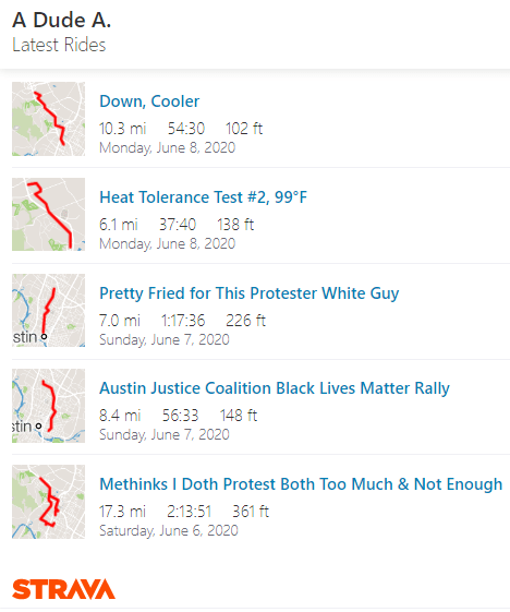 Summer again approaches Austin, America and well the northern hemisphere. With a 100 degree day forecast, the heat is on, again. It’s been almost a year since my post Surviving the Summer Heat on a Bicycle. While full of useful advice about not just hydration but acclimation and other stuff, there’s no need to repeat it, but feel free check it out. Even knowing what to do to minimize the effects doesn’t change the fact that it’s just sweaty and uncomfortable. In addition, I’ve attended several protests and demonstrations for Black Lives Matter (see posts here and here). One involved a march that was in the hottest part of the day. People were ducking into the shade, and numerous volunteers were handing out water. Add into that the increasing temperatures from global warming, and it’s that least wonderful time of year: summer. How can we make it less of a bummer?