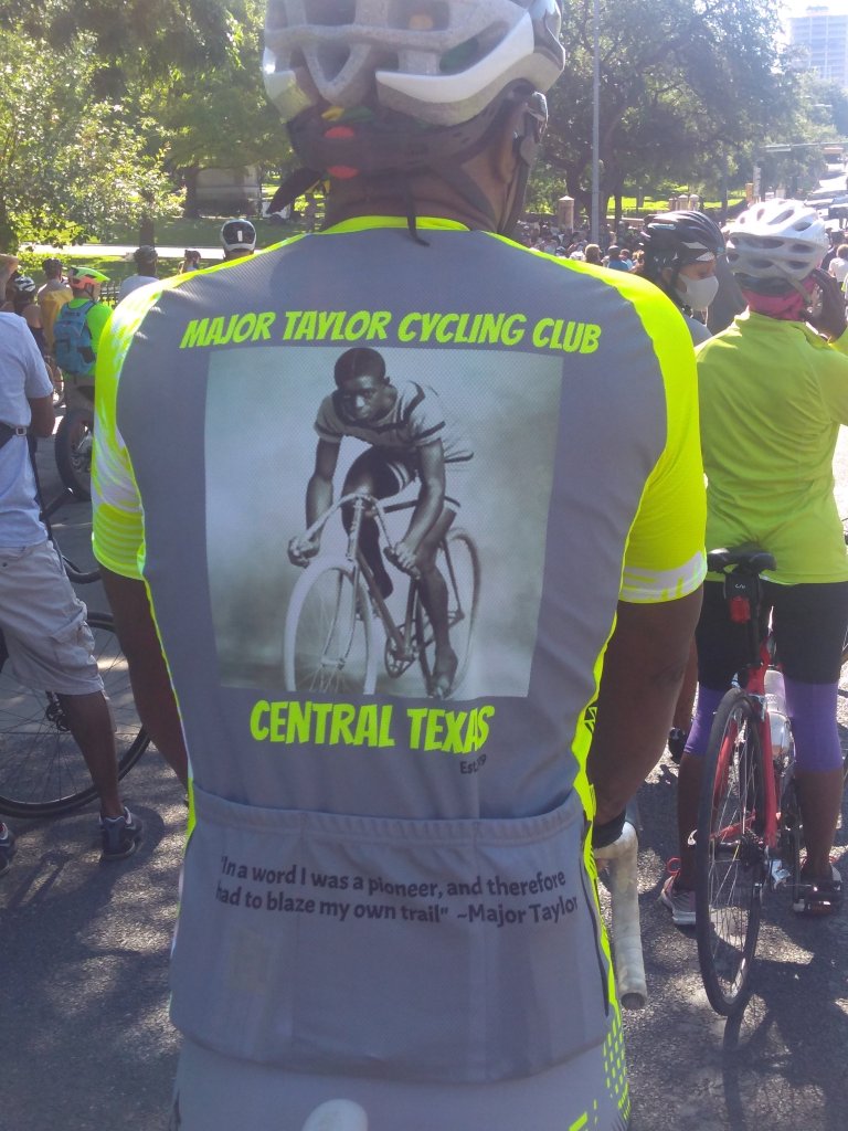 Upon arriving at the Texas Capitol, where the masses of cyclists shut down the streets, the organizer and professed history nerd Talib was talking about the African American memorial. We couldn’t get in to look at it, because the grounds have been closed since the worldwide protests against police killing George Floyd, Breonna Taylor and locally Mike Ramos and many more. I spied several people in grey and bright yellow racing kits, and spoke with one of riders. It turned out they were members of the Major Taylor Cycling Club, which has chapters in various states. I hope to follow up and do a separate post about MTCC.