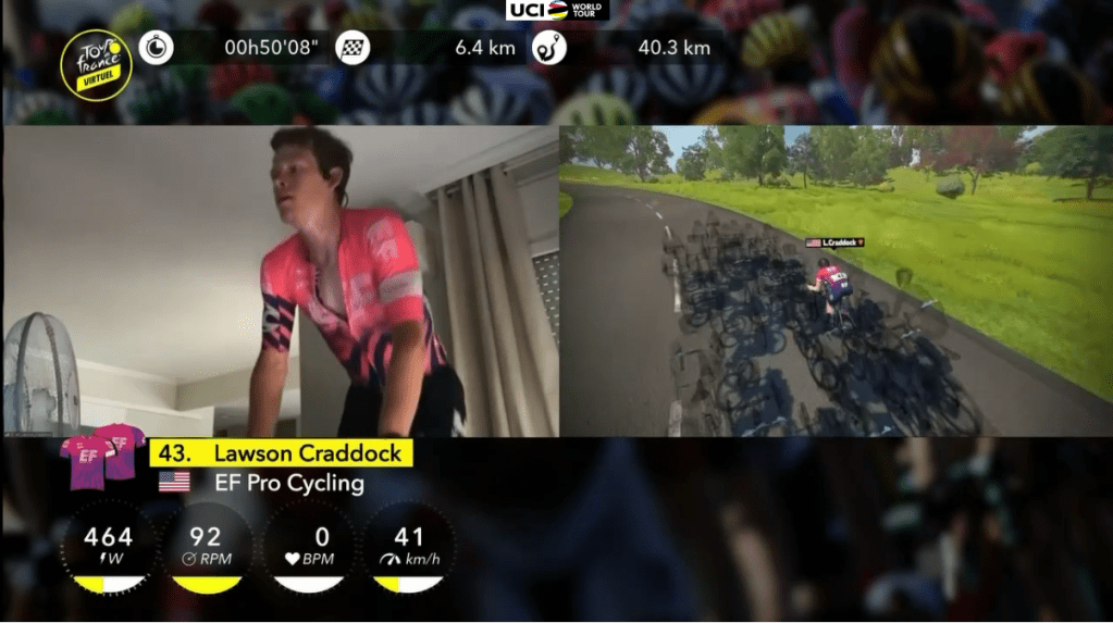 One thing that’s happening right now for both women’s and men’s professional teams is the virtual Tour on Zwift. The online competitive game where you ride your bike on a trainer connected by computer allows you to race people around the world. I’ve never used it, but many pros and plenty of riders as good as the pros and many amateurs and friends I follow on Strava do. While no substitute for the real thing, Zwift requires real skill in being able to ramp up one’s power to beat everyone else to the line. Austin resident Lawson Craddock — he of the broken scapula on day 1 of the 2018 Tour, whom I’ve met in person and is rumored to be on EF Education First’s roster for the 2020 Tour — took part and was finishing strong in the top 10 on Stage 4.