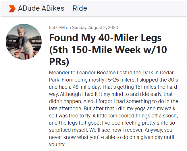 At 5:47 PM on Sunday, August 2, 2020, I headed out on Sophie my trusty Fairdale after an appointment I had ridden six miles to get to. I thought I’d put in another 14 miles to make it another 20 for the day. But in the back of my mind was the thought, “I’ve got several 150-mile weeks in a row under my belt. If I stop now, I’ll break that chain.” And if you know A Dude, you konw he likes to #DontBreakTheChain (first noted in Jerry Seinfeld & The Juiceman Can Teach Us About Making Healthy Choices (Day 2). There had been a little rain to cool things down, I was feeling a little better, and as the title says, I found my 40-miler legs. Sounds easy right? Maybe I make it seem that way, but nope, it’s never easy. Allow me to explain.
