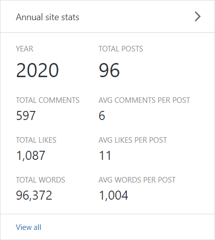 As for how many posts, word count, comments and likes, this WordPress graphic tells the tale of what has been happening. At three posts a week, I’ve written the equivalent of a novel just this year alone (and probably the last two as well). I’m a bit less wordy than I have been in past years, I believe, which his a good thing. This blog is not blowing up the popularity charts or anything. But for a site that doesn’t promote itself through social media, it’s got a nice little following. Thank you if you’re part of it!