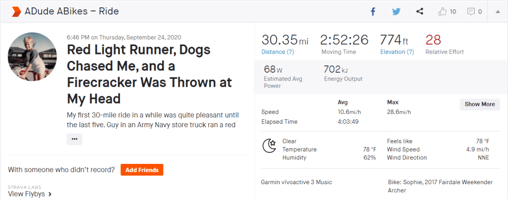 Yes, you read that right. I was biking, and some poor, misguided soul, correction, a major assclown in a car slowed down to throw a firecracker at my head. But that wasn’t all. The firecracker throwing happened after a guy in a truck sped through the turn at a red light without yielding in front me, which could have resulted in major pain or death were I not such a defensive rider and excellent bike handler. But shortly thereafter I came upon his shop where his loose barking dogs came at me. Usually my evening bike rides aren’t as eventful. This one saved all the excitement until the last 20 minutes. Let’s go to my Strava description.