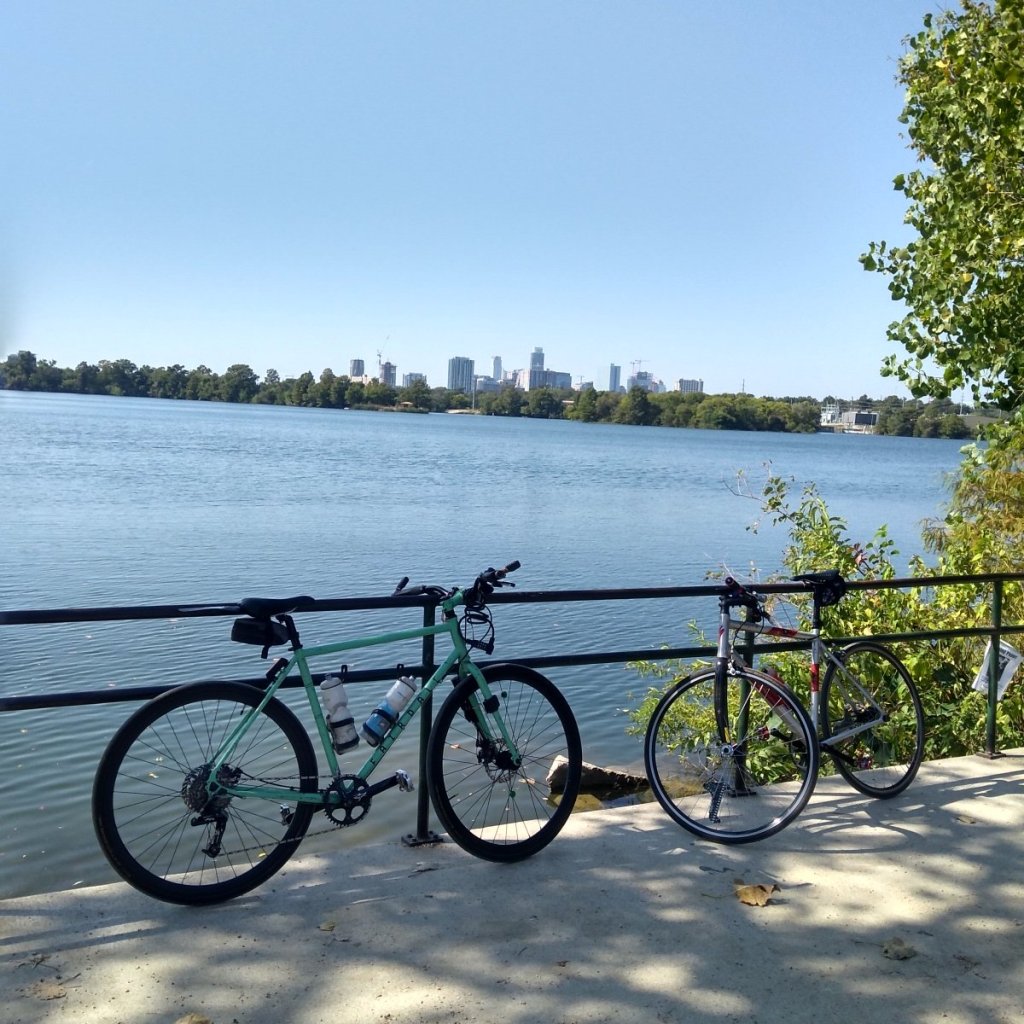 Rafael had accepted the invitation thinking he’d be riding his tandem bike with his partner Jenni, but she wasn’t feeling great so it was just him. He also informed me that he had a strained muscle and I noticed he was riding his fixed wheel (only one gear) bike. In a way, that was a relief, because it made it more of a fair fight. You see, I once joined a ride he led which was above my security clearance and pay grade. Eventually I got dropped. Ever the encourager, he said on this ride he doesn’t think I give myself enough credit. Even though he knows my average speed is around 10 mph, while his is around 15. Anyway, we had a nice time pedaling around East Austin, downtown and then Town Lake.