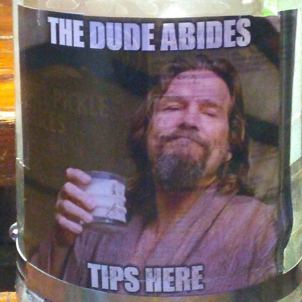 After a few minutes we rolled on. Heading north and then back south again, we eventually made it back near my abode. Saurabh always wants tacos, before, during and after a ride. I said he had to earn it, but when we stopped at a nearby university student hangout, we each got hamburgers. Mine was a turkey double with Swiss cheese and sweet potato fries and ranch dressing. Granted, not the healthiest of meals, so sue me. The tip jar had a picture of THE Dude and the phrase this blog is an homage to: The Dude Abides.