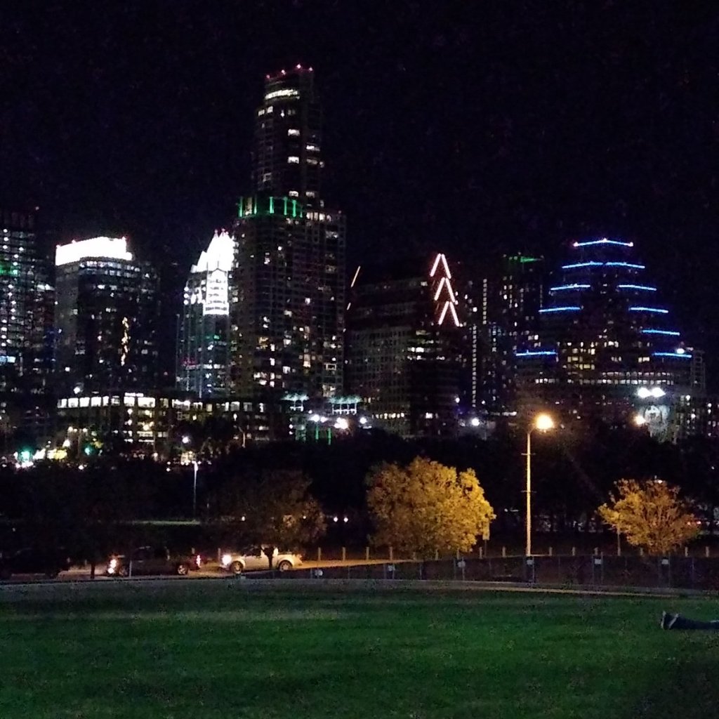 The most interesting part of the ride was finding ourselves downtown outside the performing arts center. Someone had the great idea of using the concrete patio as a roller rink. A handful of skaters made laps while a DJ spun some funky but laid-back music. We watched as the people rolled by. One in particular had some very long legs and some pretty smooth moves. Some of them had skates that lit up. Other gawkers stood around, and a few skaters talked to each other while some kids played on a light display. The star attraction though was the downtown Austin skyline which sparkled in front of us.