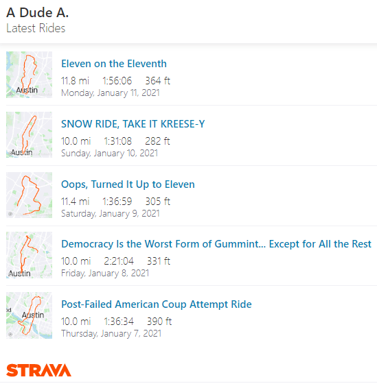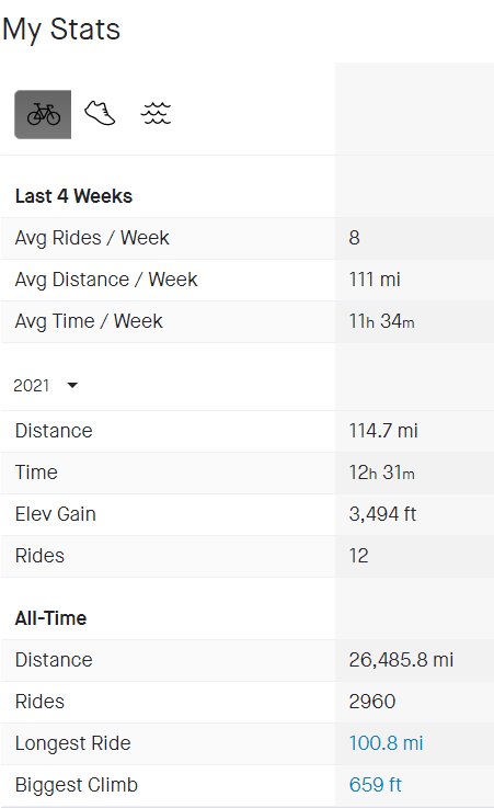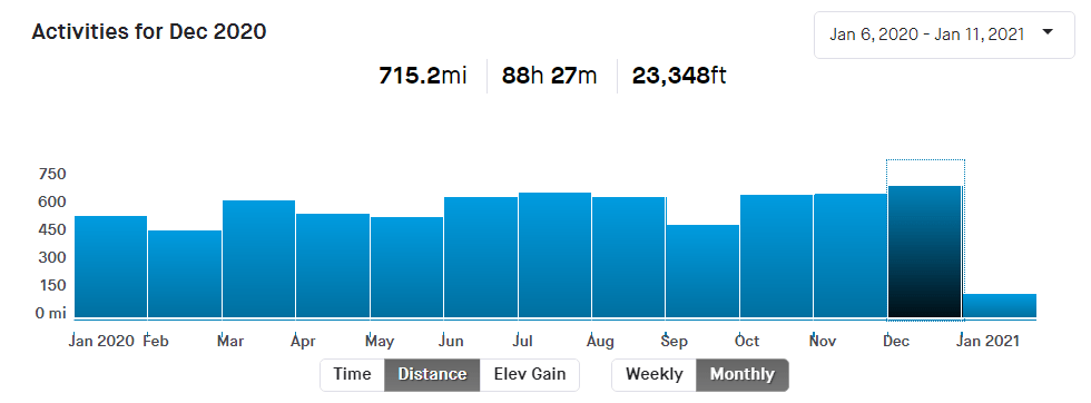 You can see from the My Stats image, compared to last month’s, that my mile average distance per week is down from 169 miles to 111. That’s in keeping with this year’s reduced riding regimen, and it will come down further as 2020 fades away in the rear view mirror. I’m fine with it, because I think I really overdid it last year and am paying for it now in tiredness. If I ride even half of that in 2021, I’ll still be at a six-year average of 5,000 miles per year. Put that in your pipe and smoke it, ok? (Assuming most people reading this, at least in the U.S., don’t smoke, just go with the cliché, alright?