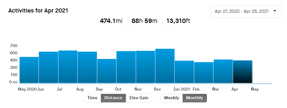 - Although my biking goal in 2021 started out as being half of 2020, it’s looking a lot more like it’s going to be closer to the mileage of 2019 or 2016. I’m not sure why that is, except I just like the symmetry of saying I biked 100 miles a week.