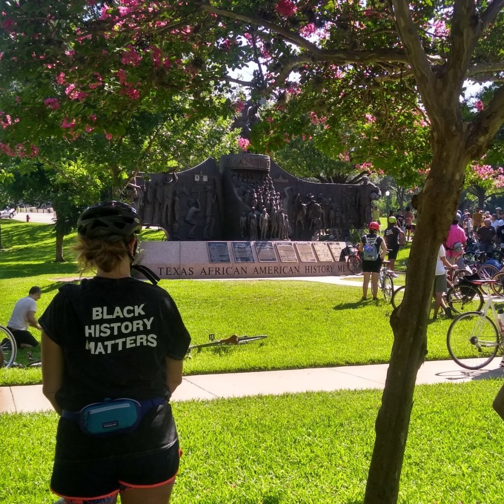 Organized again by Talib Abdullahi and a team of volunteer ride leaders, medical street team, snack crew and more. There was support from the Bike Farm van and mechanics from Mellow Johnny’s and Specialized (opening a store in South Austin later this year — you heard it here on ADudeAbikes.com first). Speakers included: Austin City Councilmember and Mayor Pro-Tem Natasha Harper-Madison, Visit Austin tour guide and leader Harrison Eppright, author of Integrating the 40 Acres: The Fifty-Year Struggle for Racial Equality at the University of Texas) Dwonna Goldstone, PhD, and a few others. As last year, the goals are education, community, and fun.