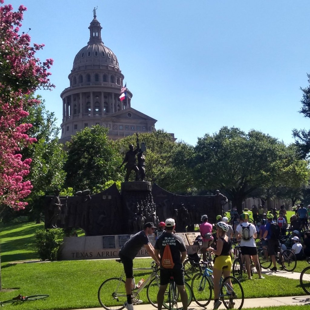 With President Joe Biden’s declaration of June 19 — Juneteenth, the day slaves in Galveston, Texas received the news two years AFTER the Emancipation Proclamation — as the newest United States federal holiday fresh on our minds, over 500 of Austin’s stalwart riders joined at the Texas State Capitol African American Historical Memorial for a Black history bike ride around north central Austin, Texas. Your reporter was there, braving the heat and sweatin’ to the oldies with everyone else. Compared to last year during the protests over the police killings of George Floyd, Breonna Taylor and others, there were a few less people. But it was still a huge crowd, and it’s a real pleasure to take over many city blocks of streets, in a huge crowd of bicycles, as far as the eye can see. Here’s my report.