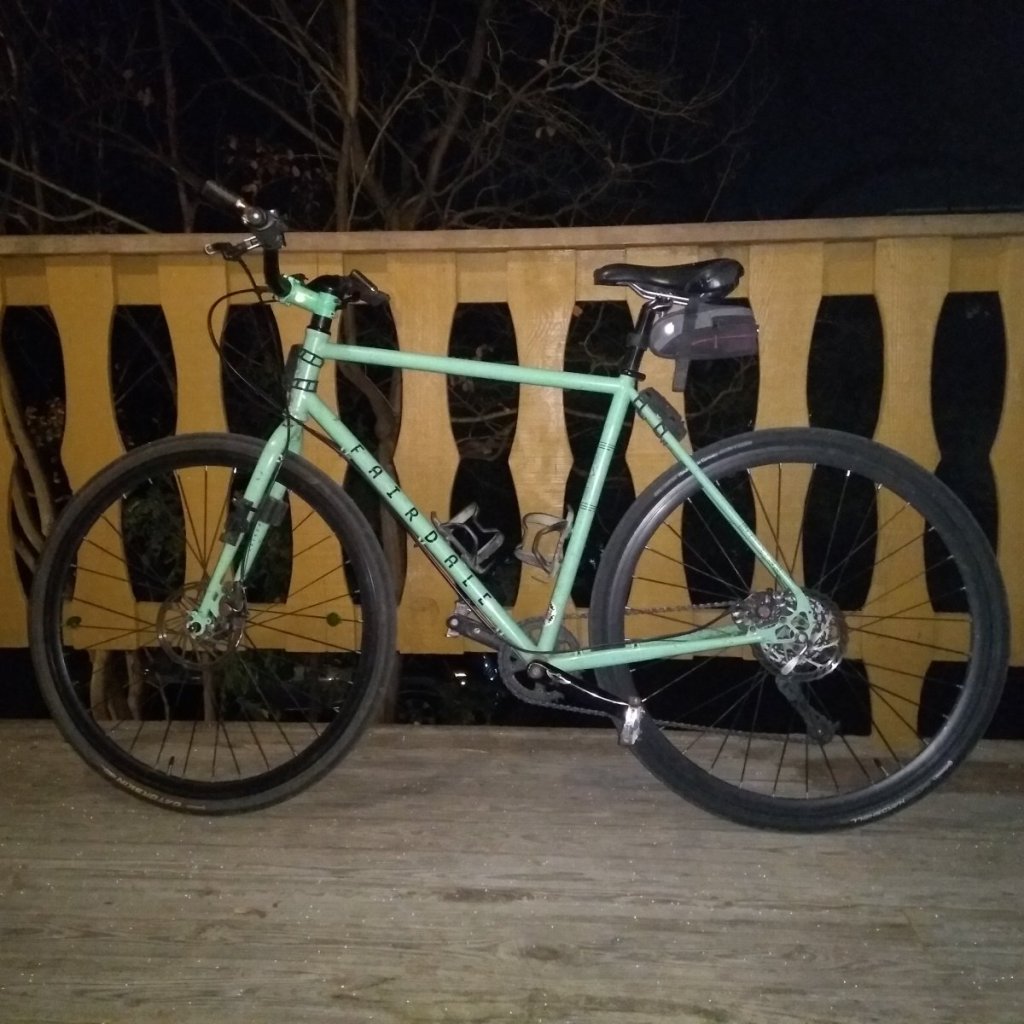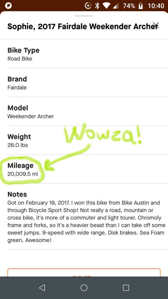It’s a pair of milestones this time for A Dude Abikes and his trusty steed, Sophie, the Fairdale Weekender Archer. I won her in a raffle from Bike Austin back in 2017, though I didn’t start riding her exclusively until January of 2018. On Sunday, we passed 20,000 miles, according to the Gear setting on Strava, the fitness app (which means “to strive” in Swedish.) As it turned out, it happened the day after 800 days I bicycled in a row. Two years, two months and 10 days if you’re wondering.