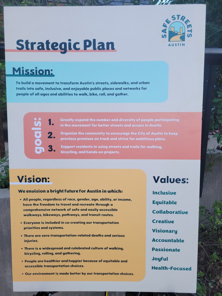 One thing that happened was Safe Streets Austin had it’s debutante ball, as it were. A merger of Bike Austin, Walk Austin, and Vision Zero, some politicos came out and made speeches, including Hizzoner himself and our one black City Council Member. (Thanks tothe racist “gentleman’s agreement” that’s still sort of in place, although Natasha Harper-Madison is a she [I’m supposing her pronouns, I know.]) Here are some photos.