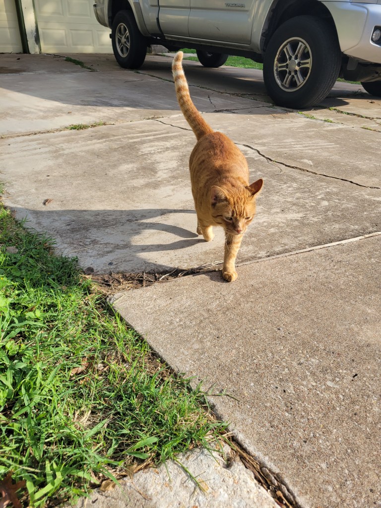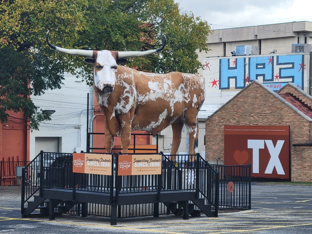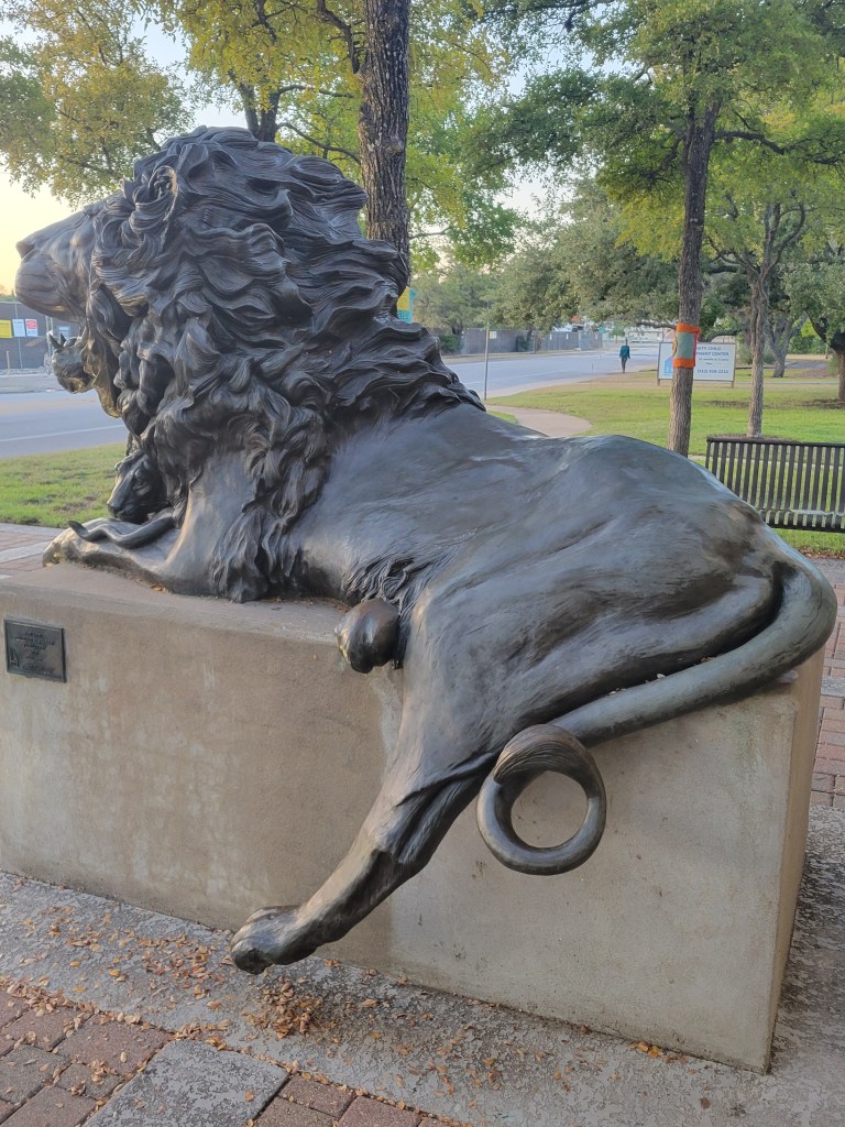 Lion outside neighborhood library; longhorn cattle, mascot of the University of Texas at Austin; a friendly orange tabby says hi.