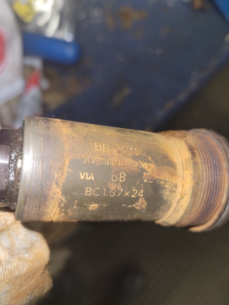 Nice rain, with a bow on it; new Pearl Izumi shoes with clip-ins; rusted cartridge bottom bracket I replaced at Yellow Bike Project.