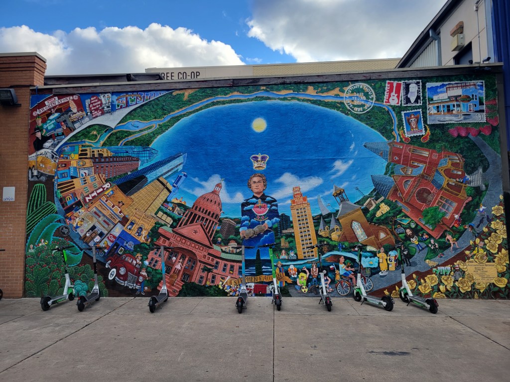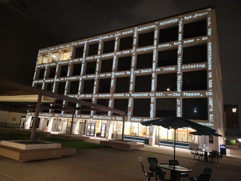 Public art mural by UT; a VW Beetle decked out as a spider for Halloween; a cool moving projected news text display at UT.