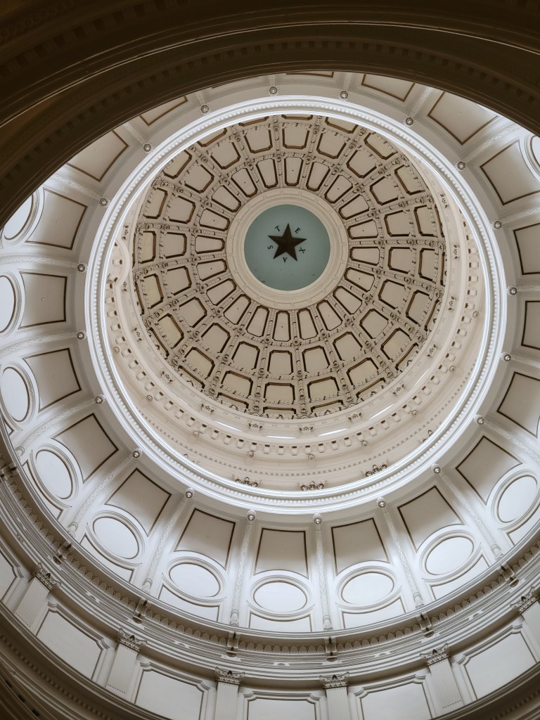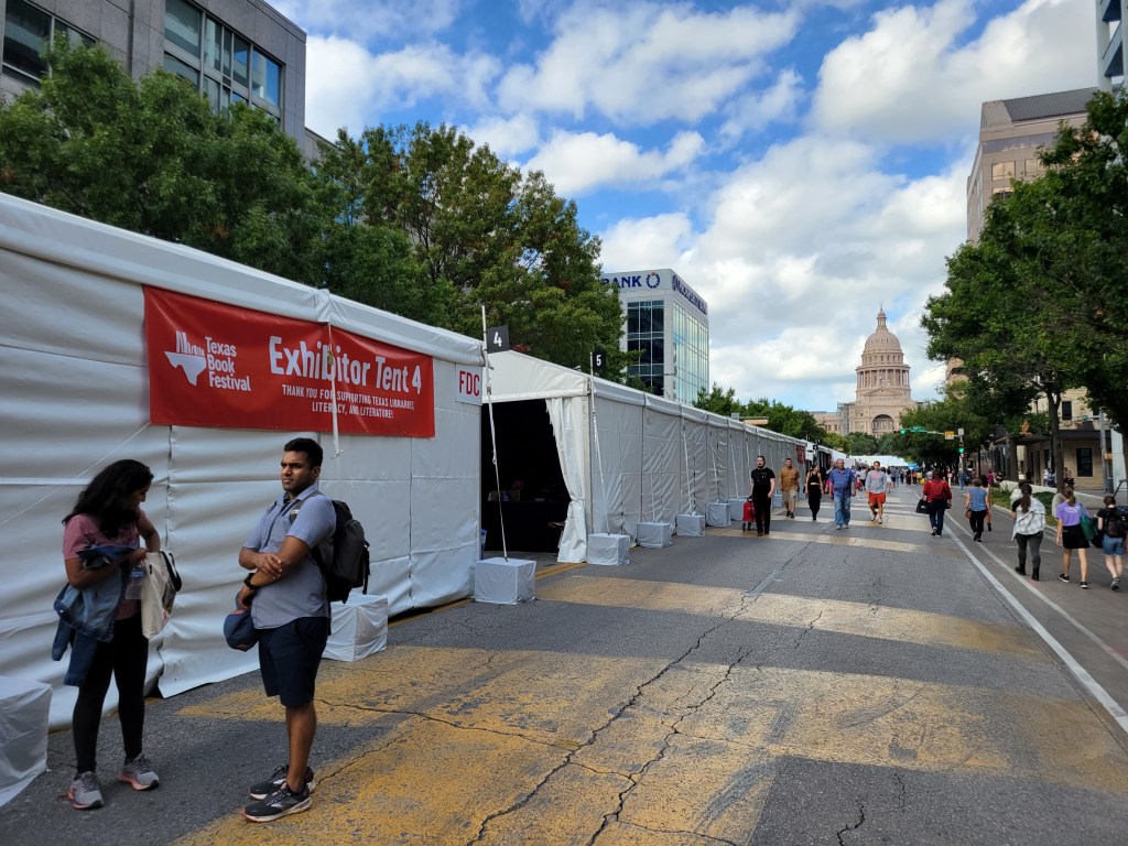 Texas capitol rotunda looking up; one of my latest reads; and Texas Book Festival tents.