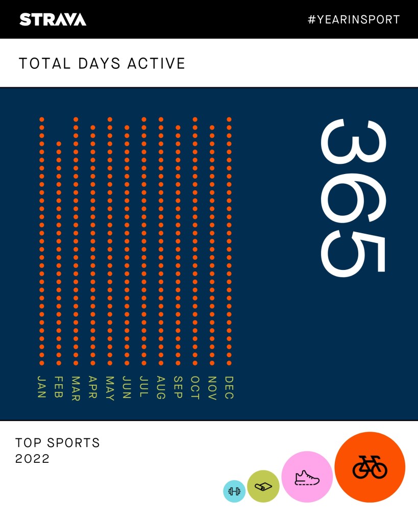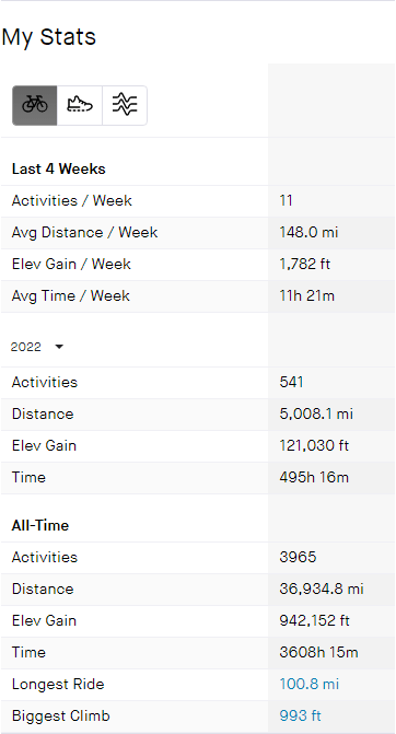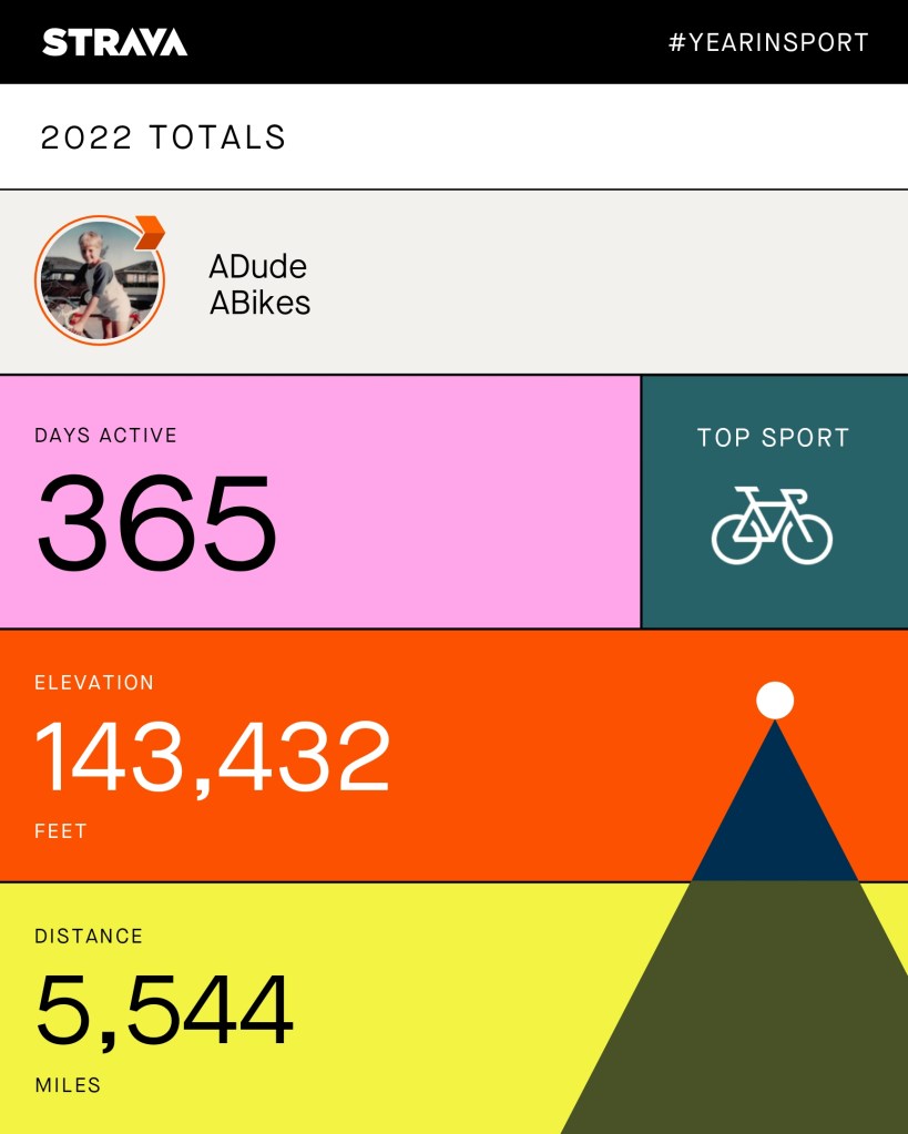 Well, another year is in the books; 2022 is history (or herstory), and here it is 2023. The changing of the calendar is always a shock to the system, but also has the hope of doing better. Before we can move forward with resolutions, goals, and the like, it’s helpful to look back. While in many ways it was not a good year for A Dude Abikes due to illness, work, and life conspiring against me, I still managed to get out there* every single day, still streaking, and string together some solid Strava stats. Let’s go to the numbers.