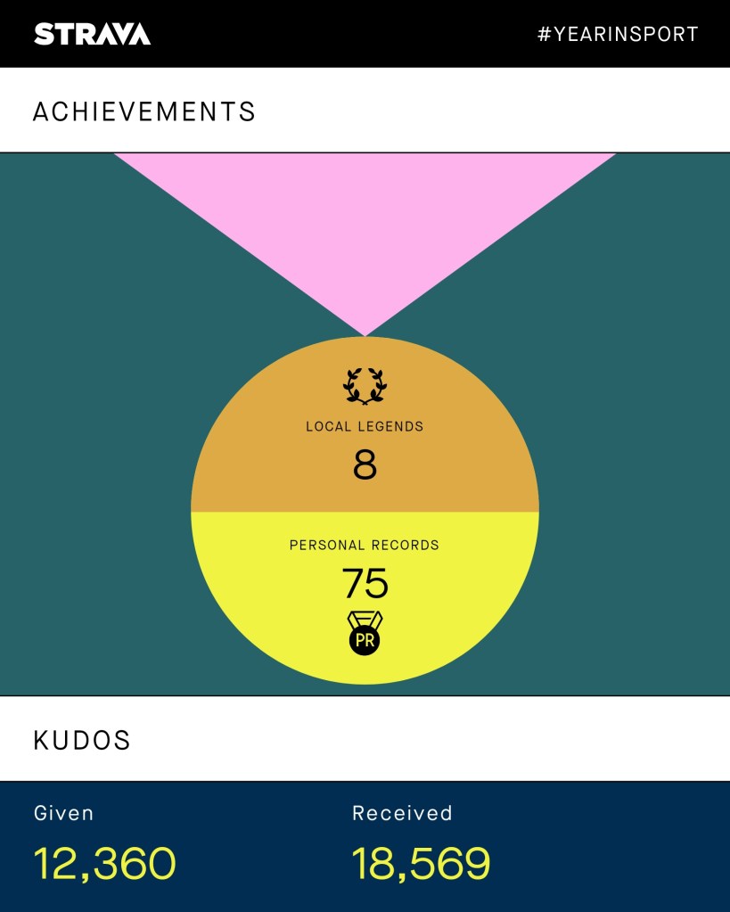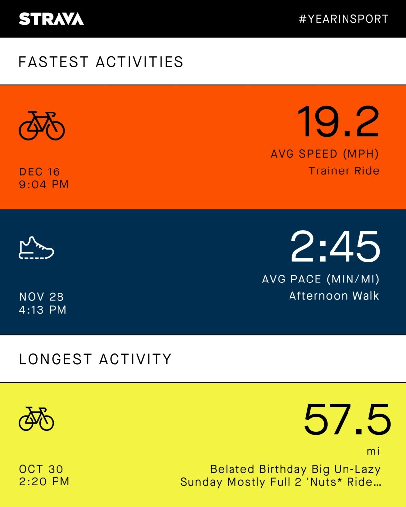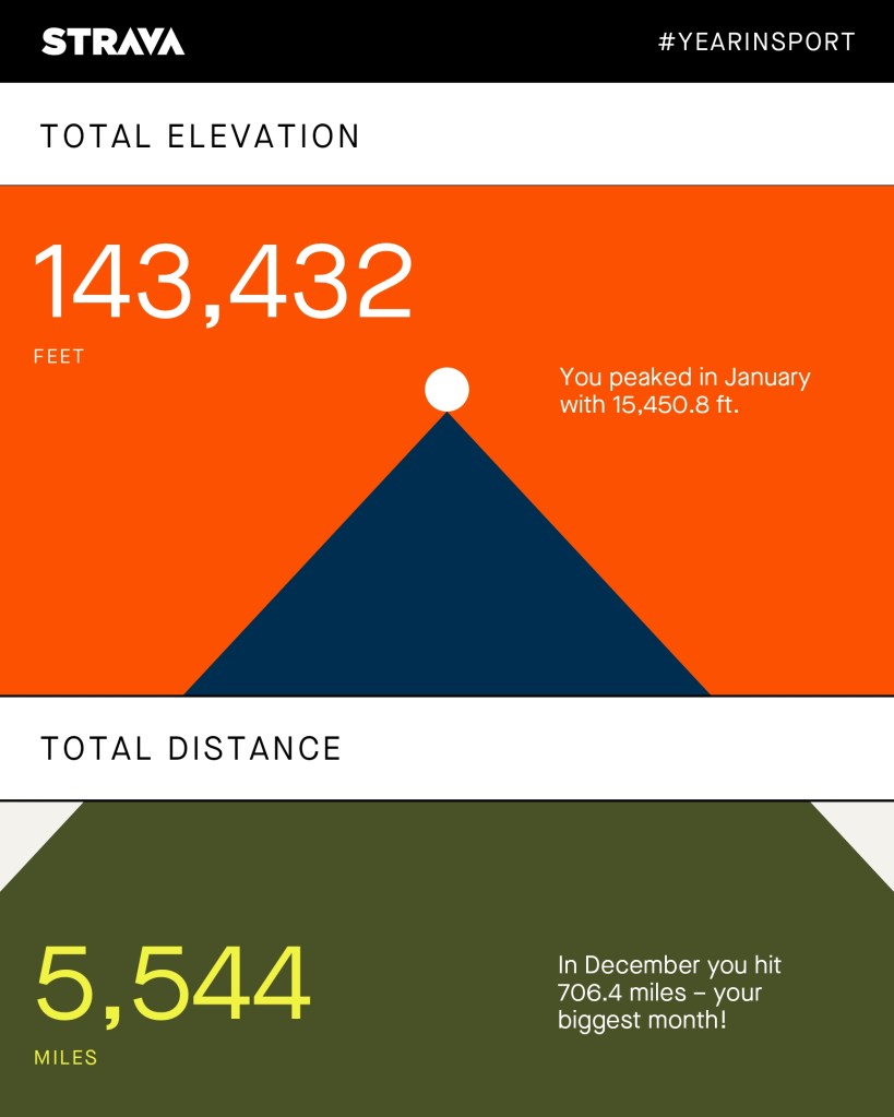 Here are some photos of my stats from Strava fitness app annual report. Elevation is like going uphill 27.17 miles.