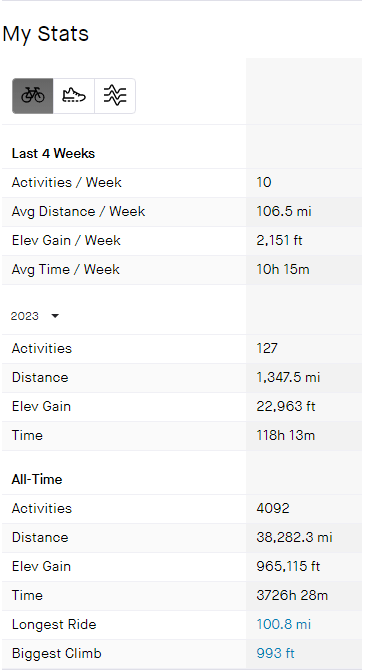 Way back B.P. (Before Pandemic), I started riding my bicycle every day. Today marks three and a half years, or 42 months, or 182 weeks and five days, or 1,278 days in a row. Also, I’ve walked daily with very few misses and many extra miles in five plus years, and I’ve done yoga daily (moreso nightly) over nine years. I continue to reflect on that, and it’s time to review my Strava activity stats for January-March 2023. Let’s take a look.