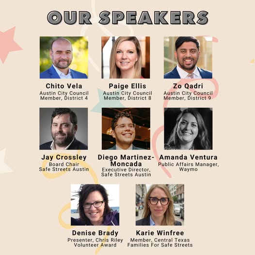 As a board member of Bike Austin, and later SSA, he was a loud, clear voice for making cycling as transportation better for everyone. He was also a subscriber, and sometimes reader, of this blog. I knew Chris some, well enough to be able to text him. Unfailingly optimistic, his presence was sorely missed at the party. His wife presented an award to a volunteer in his name, so his legacy will live on. You should pause and go read this article in the Austin Monitor. The other sad speaker was a survivor of a person killed by a car while walking.