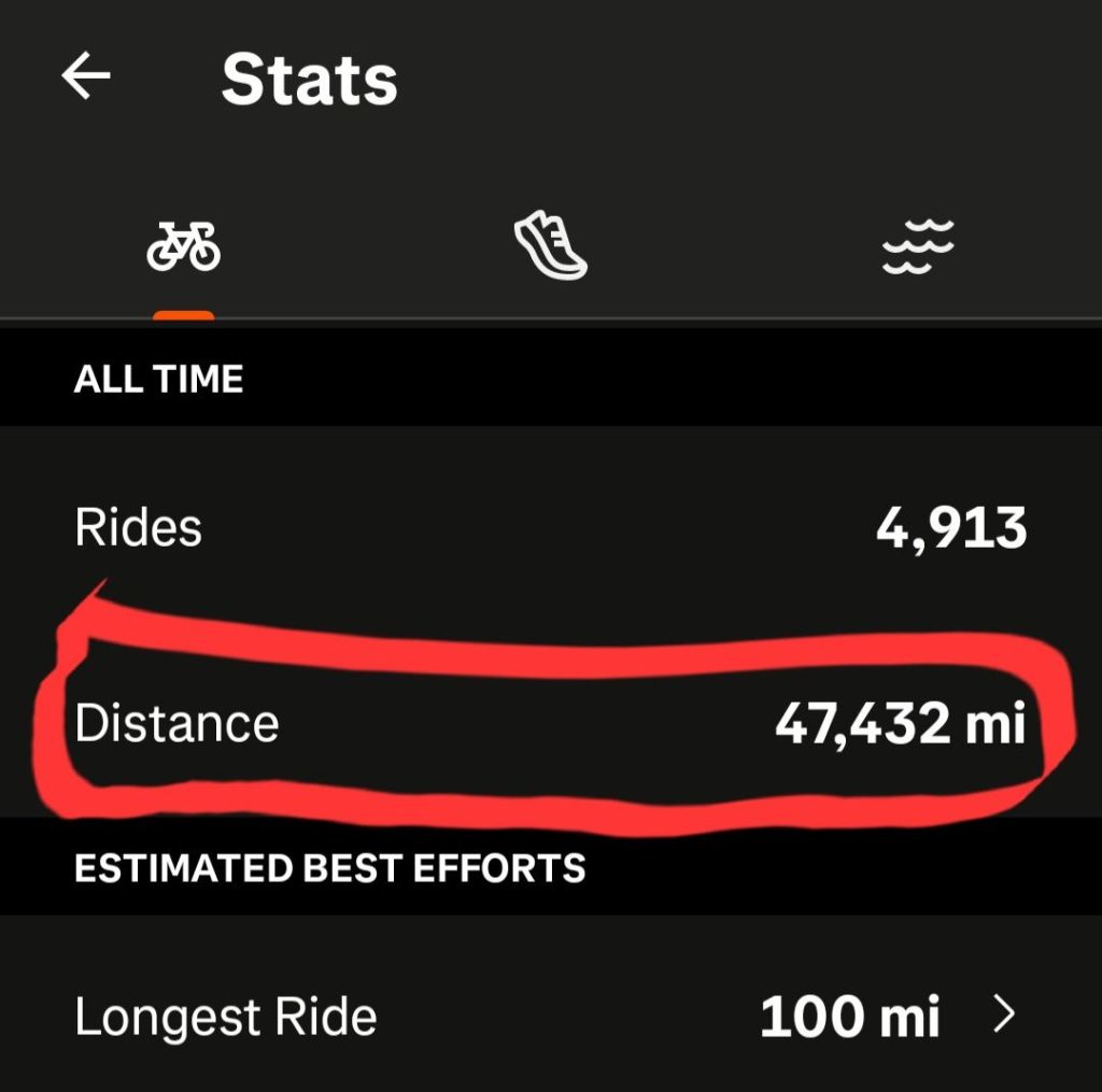 I started cycling in earnest in January of 2015 to train for the Hill Country Ride for AIDS. With all the training I did about 2,500-3,000 miles. I joined Strava in December 2015. So about 3,000 miles aren’t verified. But I was there and have witnesses, believe me.