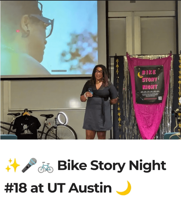 As a dude who’s been telling bits of his bike story here for going on a decade, I was curious to check it out an event called Bike Story Night. The stars aligned, meaning I heard about it in time and wasn’t busy. So, last Saturday I pedaled Soqi the Cannondale over to the University of Texas at Austin, commonly known as UT (you tee). (Check out my post about UT: The University of Texas and Me: A Short Autobiography.) There I saw a few familiar faces and a few dozen new ones. The premise is fairly straightforward: people come together to tell and hear stories about bikes. Here’s a short report.