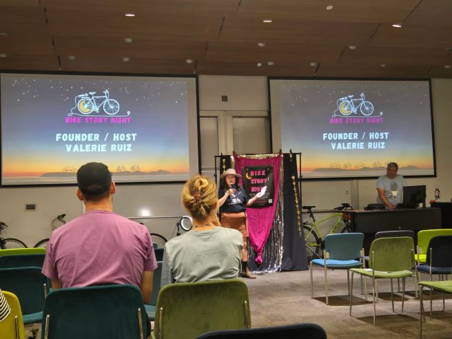 There’s an intermission, snacks and drinks, door prizes, and bike community announcements. The event is the passion of its founder, Valerie Ruiz, who has taken the show on the road to other towns in Texas. If you’re reading this the day after publication, the fourth BSN campout is happening east of Austin.
