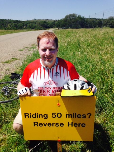 At the lunch stop, the director of the place I worked and I opted to do an extra two and a half miles down a hill and back up so we could make the final number 50. That would be my age in just under 6 months’ time. We took a picture. We looked happy, but we were also grimacing in pain. Above, it’s just me. That short but steep climb back was foreshadowing the pain yet to come on the back end of the route.