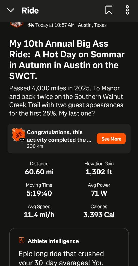 As for the long ride, this was my 10th year of doing it. The last few, I’ve stuck to the Southern Walnut Creek Trail. With the extension to one of Austin’s bedroom communities, Manor, Texas, out and back twice does it mileage-wise. I hadn’t trained as much, so it took me about 5.25 hours, with about 3 of rest stops. ‘Twas a long day, but a good day. It went well. No crashes, falls, tickets, punctures, snakes, or mechanicals, except I lost my easiest chain ring for a good bit of the back end. Seeing how I had no particular place to be, it didn’t bother me much.
